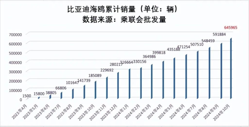 故而,当比亚迪海鸥在这个竞争异常激烈的年份,在只有8个完整销售月的情况下,以280,217辆的成绩成为2023年A00级市场年度销量冠军,到今年10月,仅仅18个完整销售月累计销量就达到了64.59万辆,并且成为了10月的全品类的销量冠军。