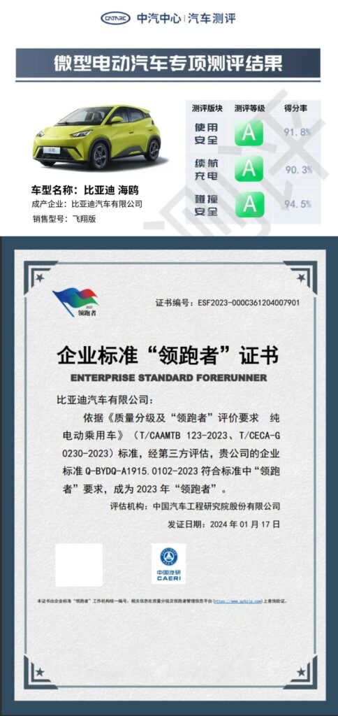 此外,鉴于此种硬核的产品力,海鸥倒也得到了行业的官方认可。在中汽中心微型电动汽车专项测评中,海鸥成为首款3A全优车型。并且海鸥还获得了中汽研“纯电动乘用车企业标准‘领跑者’”证书,一举为行业树立起了代步车的品质标杆。