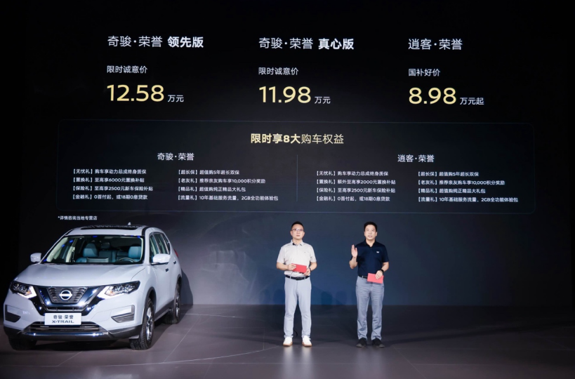 伴随奇骏·荣誉上市,逍客・荣誉也正式推出8.98万元起国补好价,并带来8大购车好礼,与奇骏·荣誉组成“荣誉CP”联袂出道,为不同需求的用户带来更加丰富的购车选择。