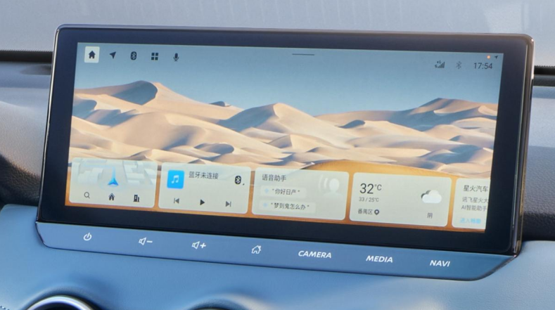 在大屏之上,手指轻触即可完成所有操作,切换丝滑流畅。同时,高清中控屏下方保留一组实体按键,方便用户驾车中途盲操,安全快速的调控车机和切换功能。