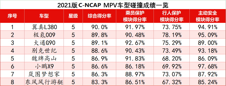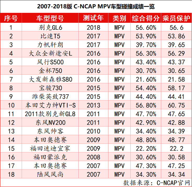 这些痛点,其实都是有数据作为支撑的,除了文章开头提到的中汽数据对MPV安全性的判定结果,在C-NCAP对2018年之前20余款MPV的碰撞结果数据可以发现,MPV的最差碰撞综合成绩最低只有21.6%分,就算取这些车型的平均值,也仅有43%分,和轿车SUV车型动辄70%~90%的成绩相比,安全质量确实堪忧。