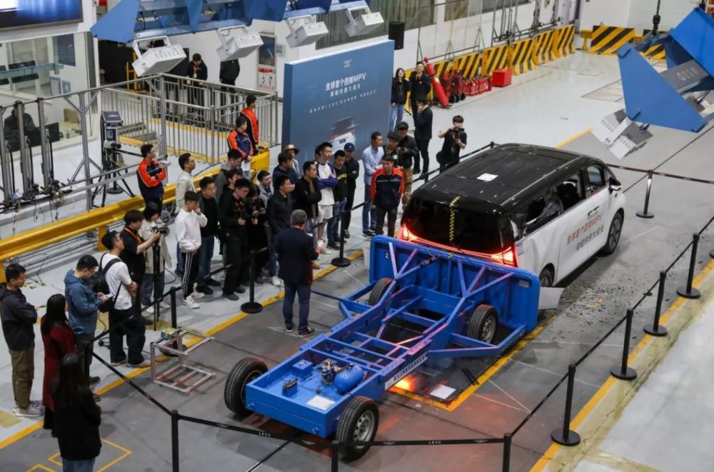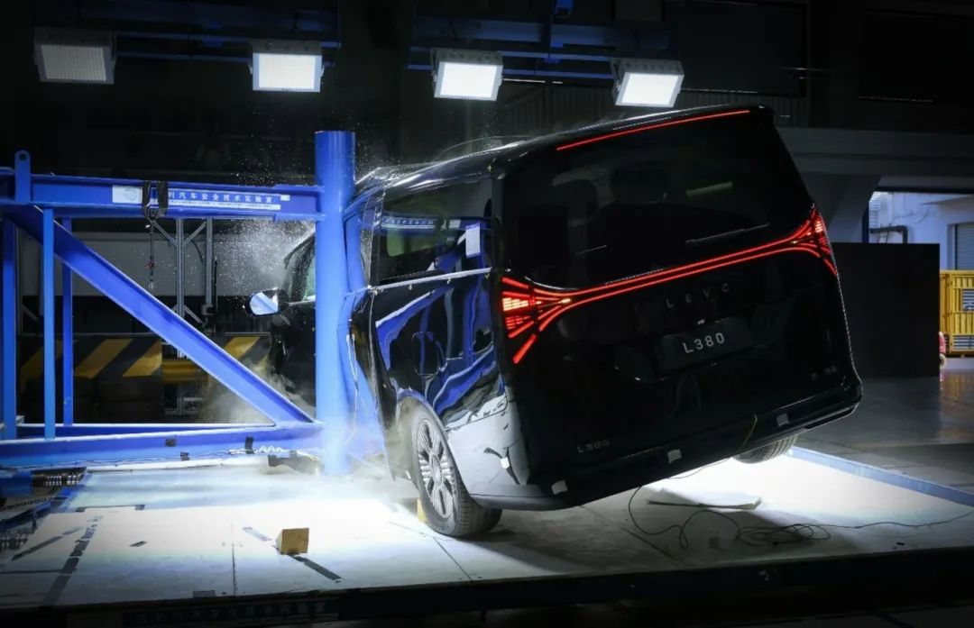 今年5月,L380进行全球首个纯电MPV双柱侧碰挑战(即法规标准点位侧柱碰试验和难度更高的二排头部点位侧柱碰试验),试验首次将第三排以及后舱点位高压电池防护列入核验中,L380全线通过共52项检测点,点检项超C-NCAP一倍以上。