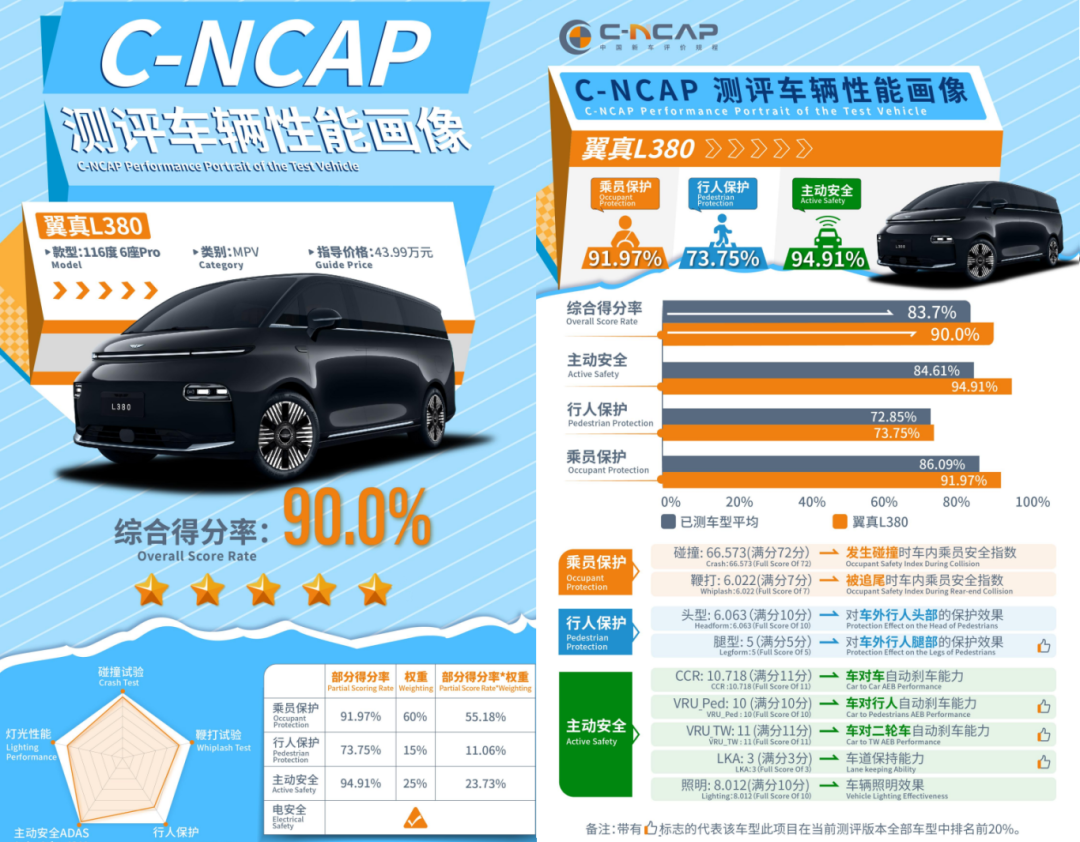 再加上前不久L380在C-NCAP 拿下了MPV史上最高的成绩,多项测试印证了L380是极致的安全王者,重新定义了MPV安全标准。