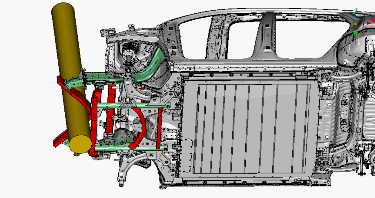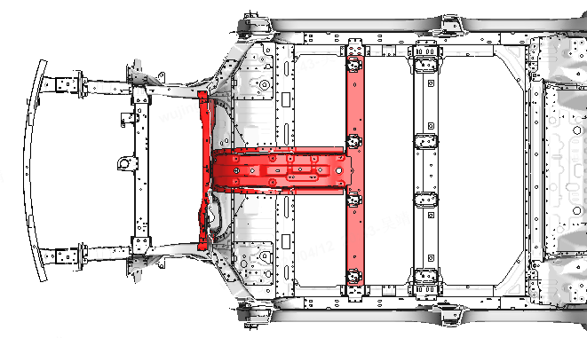 熟悉汽车结构的都知道,在汽车前机舱中,有两个主要用来在碰撞过程中吸收缓冲能量及提供支撑的纵梁,在正面碰撞过程中非常关键。但是正面中心柱碰时,柱子的撞击位置完全错开了两个纵梁,非常考验整车的结构设计。