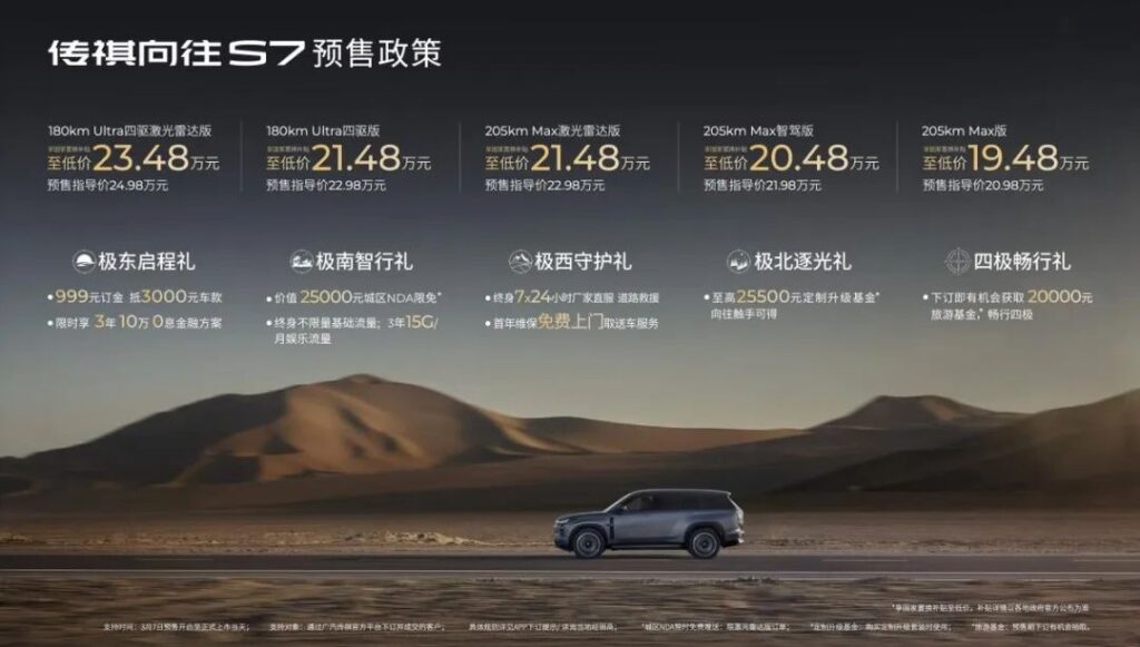 而当广汽传祺选择在全民高阶智驾风靡的这一阶段,向市场推出以高阶智驾为全新触点的向往车系,并官宣作为该车系高阶智驾第一车的向往S7,正式开启预售,预售价格(国补后)为19.48万元-23.48万元,并同步带来航空级的高阶礼遇。