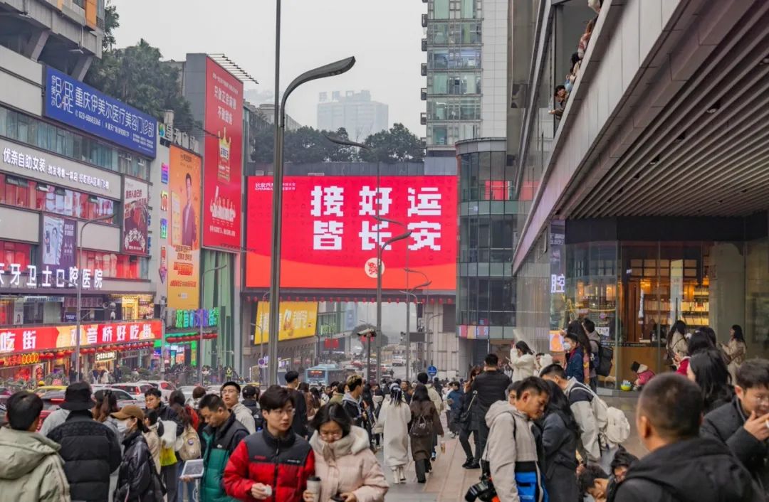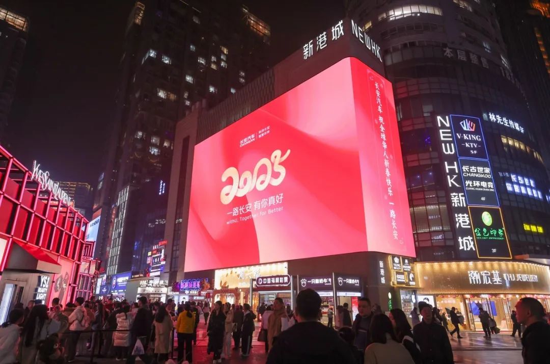 长安汽车在重庆城市热点区域精心营造了一系列“新年限定景观”,为山城披上了节日的盛装。从承包重庆最醒目的地标大屏向全国人民拜年,到街头巷尾布满创意十足的新年装饰,长安汽车以其独特的品牌魅力,为城市节日氛围添上了浓墨重彩的一笔。