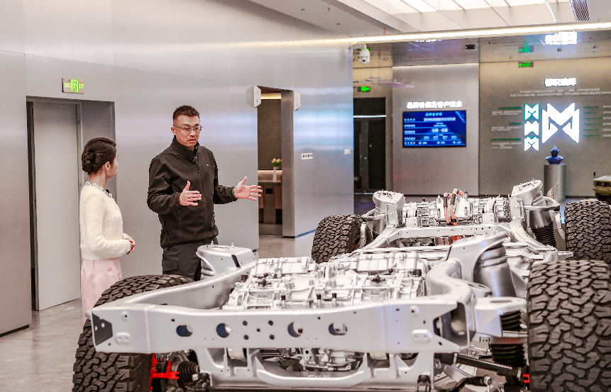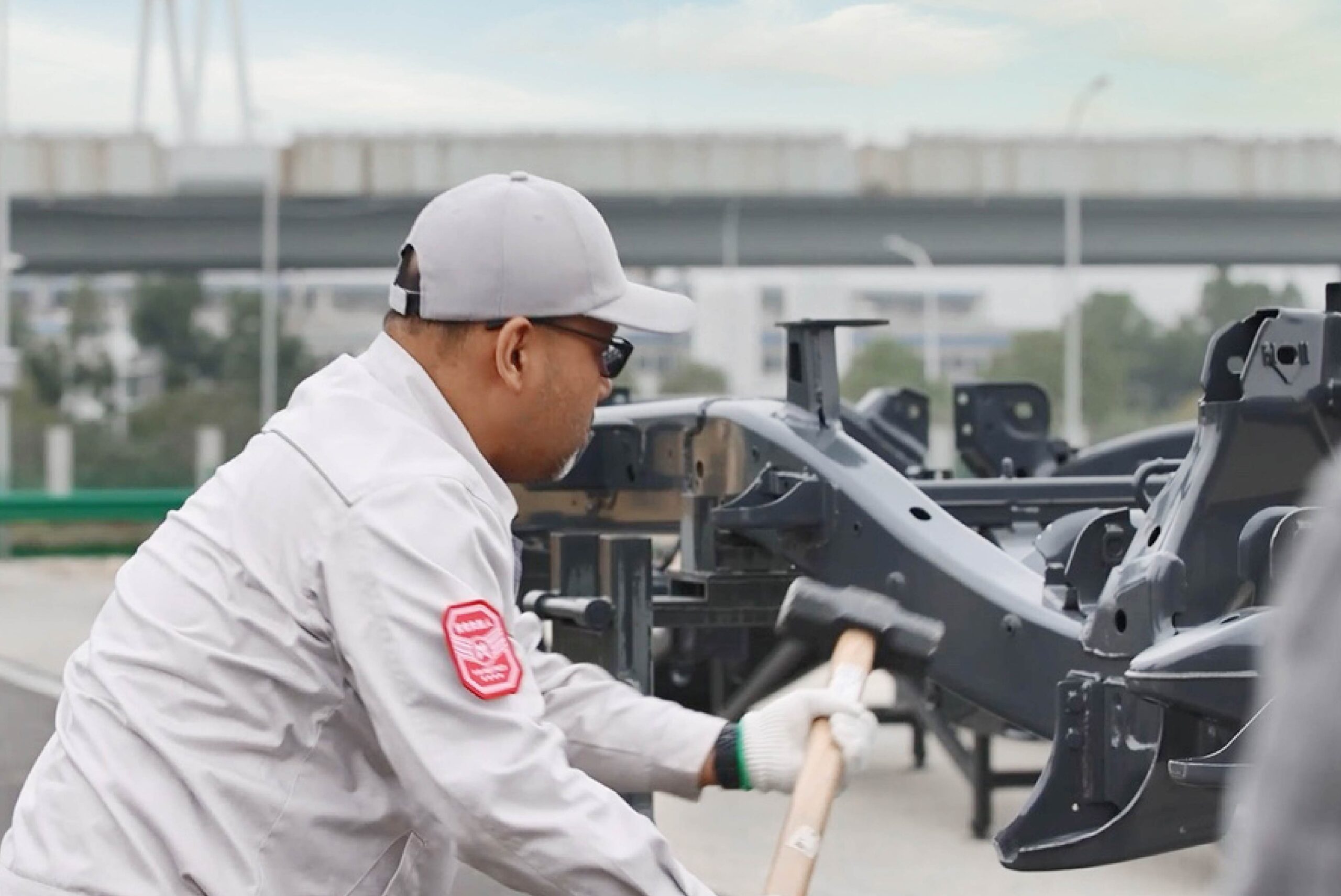 3月1日,在位于湖北省武汉市的东风猛士科技园区的猛士品牌专场推介会上,东风猛士科技先进智造工场总监陈辽用铁锤砸猛士917车架。