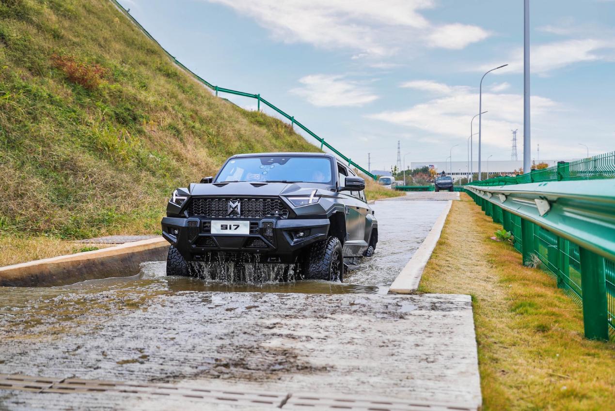 涉水体验环节,东风猛士917稳健驶过900mm的最大涉水深度,远超国标要求的300mm,是国标的3倍。无论是城市暴雨积水还是越野浅滩溪流,东风猛士917都能轻松跨越,全地形适应能力爆表。