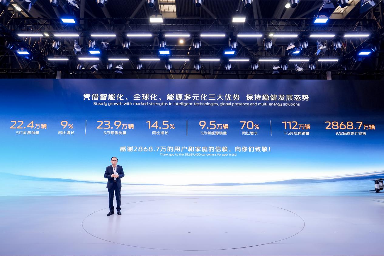 在本届车展上,长安汽车不仅以一系列创新创业技术和产品成果展现了企业的深厚底蕴。同时也以一组亮眼的数据展现出企业蓬勃的发展态势。5月公司零售达23.9万辆,同比增长14.5%。其中新能源销量达9.5万辆,同比增长70%。1-5月总体销量112万辆。截至昨天,长安品牌累计销售已达2868.7万辆。