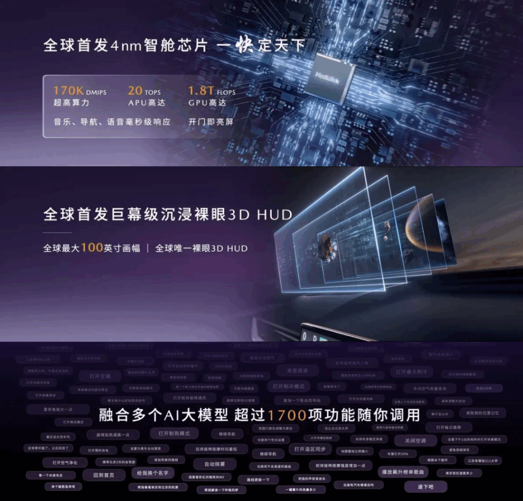 就拿MAZDA EZ-60来说,虽然是更中国的产品,比如采用了超愉悦AI智能座舱,全球首发了最大画幅100英寸裸眼3D HUD,全球首发联发科技MT8676 4nm芯片,还有超画幅26.45英寸5K视网膜一体式大屏,人-车-环境跨模态的人机交互AI框架,超过 1700 项功能可随时调用的AI助手,双零重力座椅,23个高品质扬声器等。