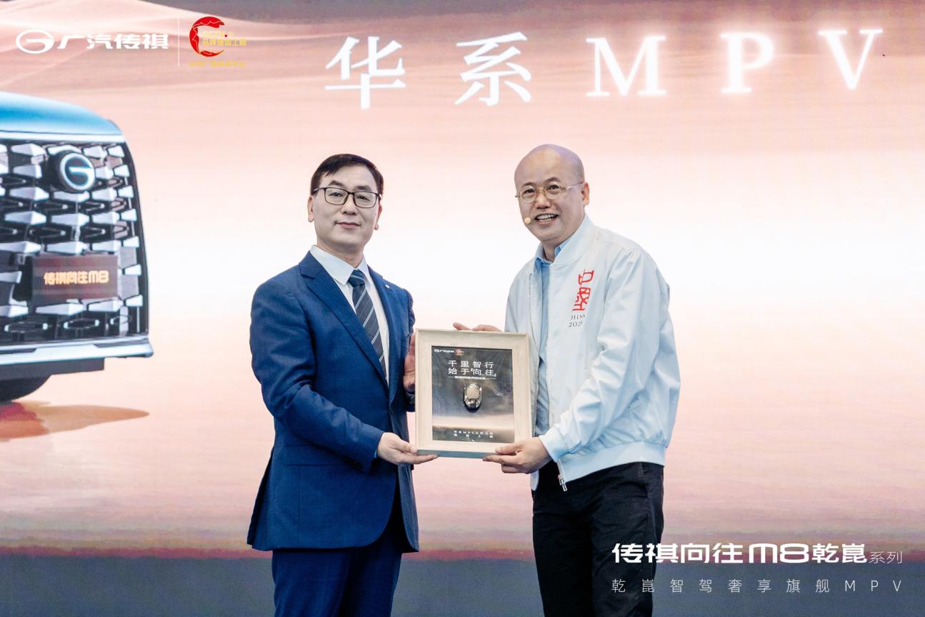 【广汽集团传祺营销本部负责人郭百迅将传祺向往M8乾崑车钥匙交付给首位车主毛继鸿(例外/方所创始人、董事长)】