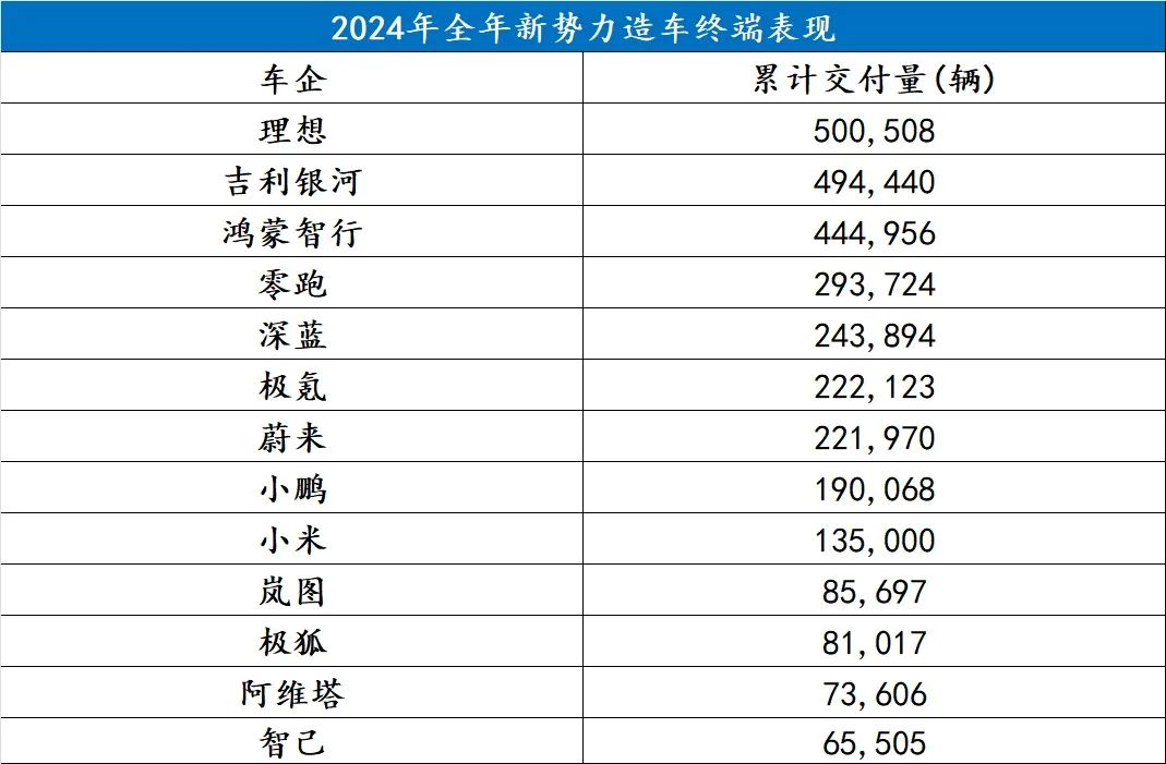 由此将视线聚焦一个占据绝对声量与关注度的群体——新势力造车,刚刚结束的元旦假期,又到了仍留在牌桌上的选手,按时公布2024年全年终端成绩单的日子。