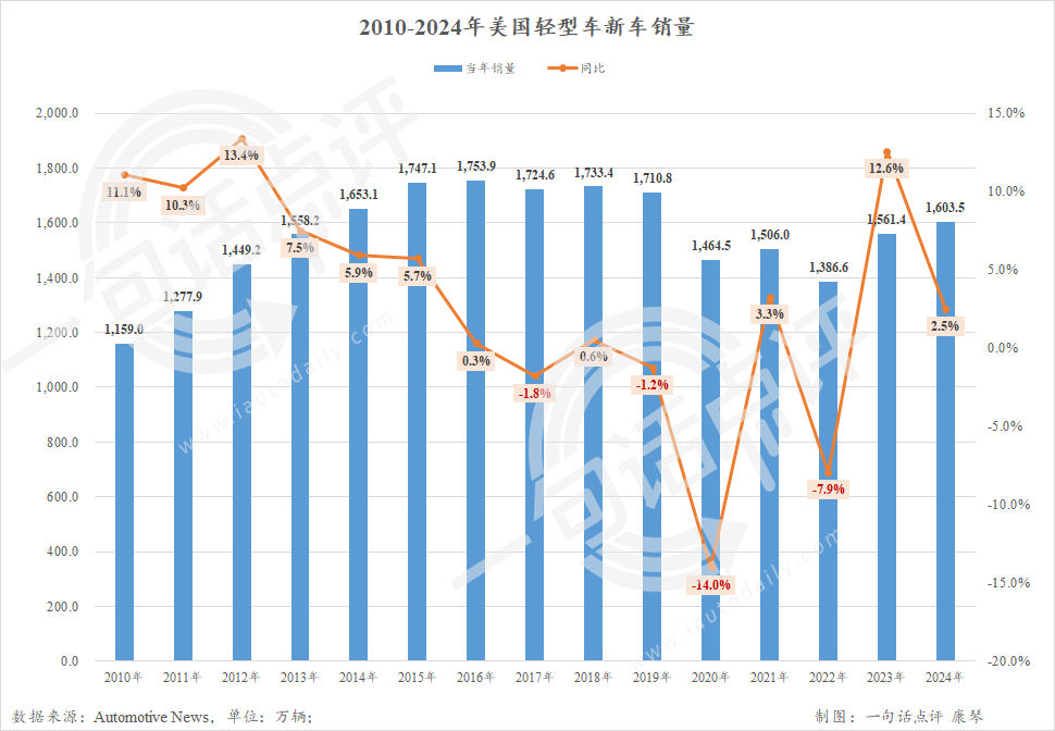 综上可知,近期美国车市的走势应该没有分析师们预期那般乐观。此前行业普遍认为随着新车库存的恢复、终端优惠力度的增加和贷款利率的下调,在去年重回1600万辆的基础上,2025年美国轻型车市场的销量将继续增长。