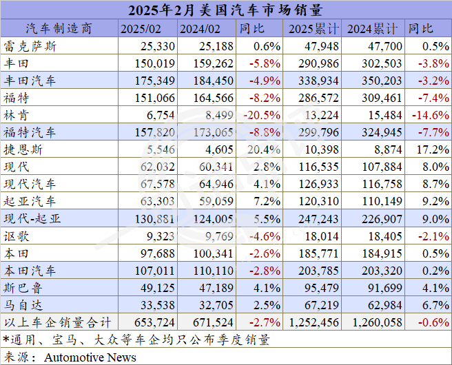 依次而言,由于去年同期的对比基数较高,2月丰田汽车同比继续下跌4.9%,这已是去年12月以来其在美国市场连续第3个月走跌。其中,丰田品牌同比下跌5.8%至15.0万辆,雷克萨斯则基本只与去年持平。