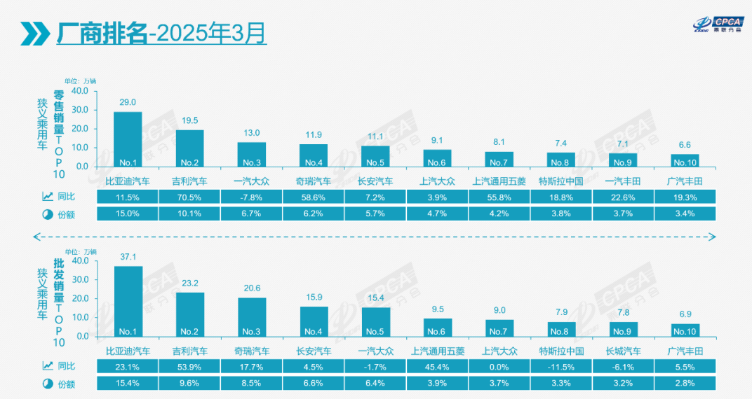 与之相呼应的是,在3月的车企零售与批发销量十强的榜单里,头部自主车企们继续占据着绝对的优势地位。