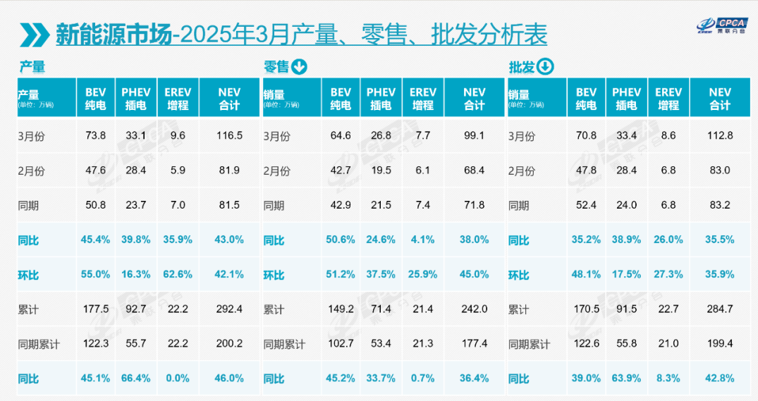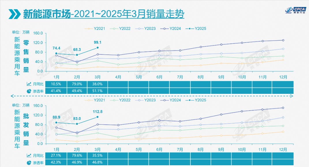 具体而言,3月新能源销量零售同比增长38.0%至99.1万辆。