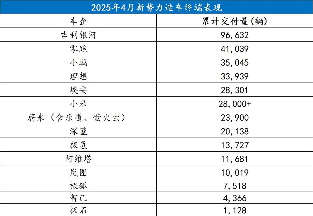 相比之下,最近深陷舆论漩涡、鲜有发声的小米,仅仅凭借SU7一款产品,4月交付量便超过28,000辆。