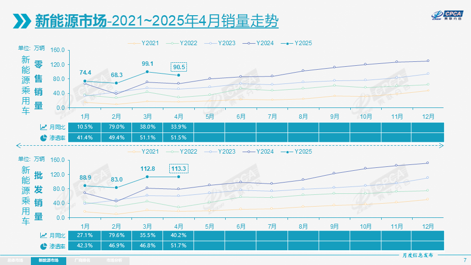 由此把视线拉回到4月终端成绩单,新能源乘用车批发销量达为113.3万辆,同比增长40.2%,环比增长0.3%;新能源乘用车零售销量为90.5万辆,同比增长33.9%,环比下迭8.7%。