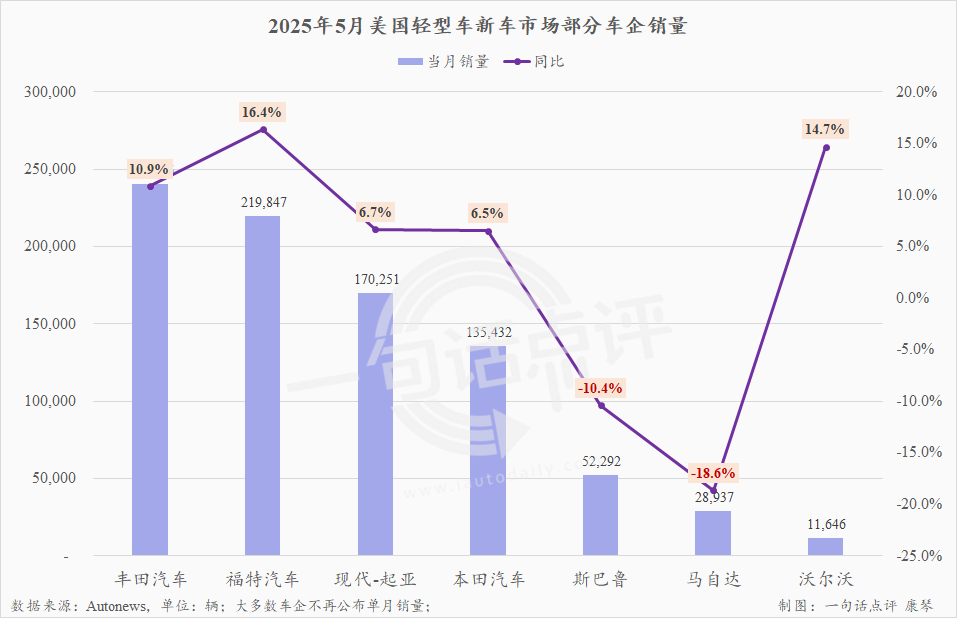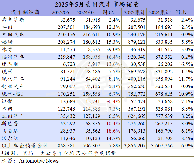 虽然,早在4月3日新关税政策就开始实施,但截止5月底大部分车企还没有对旗下车型涨价。只是,在3月和4月同比增幅保持10%以上,销量也分别创下159.1万辆和146.3万辆的近年同期历史新高之后,5月美国轻型车新车市场增速明显放缓。