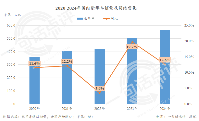 根据最能反映市场真实情况的上险数(含国产和进口),2024年国内共售出565.1万辆豪华车,同比增长12.6%。显然,继2023年由419.2万辆大幅提升至501.7万辆之后,2024年国内豪华车市场增长势头有所放缓,新增量为63.4万辆。