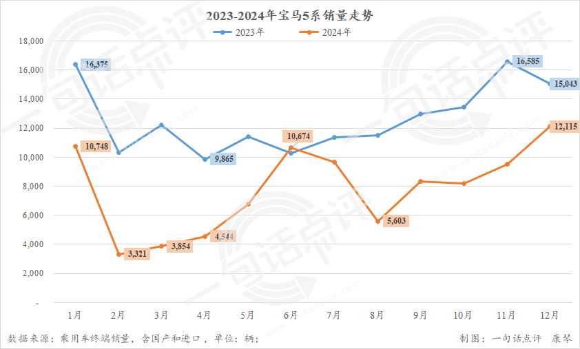自从去年1月底全新一代国产车型上市价格回收后,宝马5系(含少量进口车)的销量出现断崖式下滑,2月至5月共计只售出1.9万辆,在终端优惠最高可达12万元的刺激下,6月才再次回归万辆达到10,674辆,但此后却再度回落数千辆,12月才又一次达到四位数,最终全年仅售出9.3万辆。