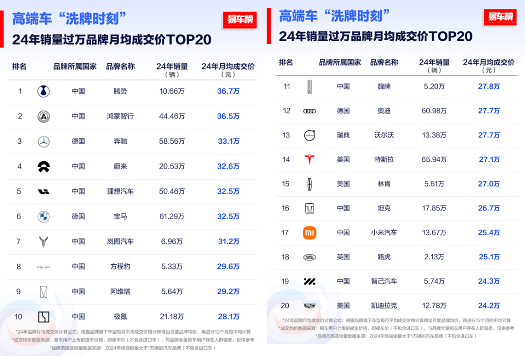 根据日前出炉的一份2024年销量过万的国内乘用车高端品牌(不包含进口车)成交均价榜单,去年国产车中成交均价最高的不是BBA,自主阵营的腾势和鸿蒙智行分别摘得冠亚军头衔,两者的成交均价皆超过35万元,奔驰仅排名第3,宝马和奥迪更只排第6和第12。