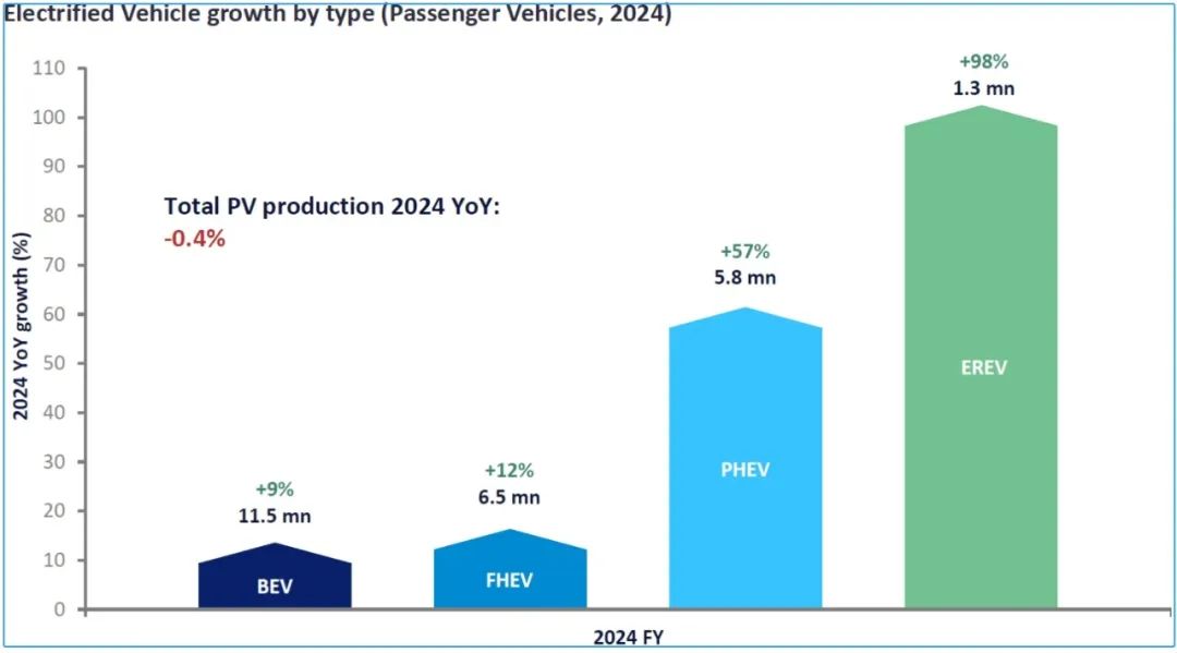 相较于纯电动汽车,插混技术凭借更小的电池即可实现更长的续航里程或承载更重的负载,这一优势尤为突出。中型和大型汽车,尤其是SUV车型,被视为插混技术的主要应用领域,预计将广泛采用这一技术。