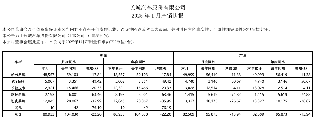 同样作为自主多强的一员,长城汽车在这个1月迎来了销量上的小幅度下滑。根据官方发布的数据,长城汽车1月汽车总销量8.09万辆,同比减少22.2%。