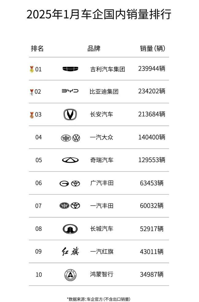 例如,比亚迪1月总销量突破了30万辆;吉利以近24万辆的国内销量,历史性超越比亚迪的23.4万辆(不含国外),以5742辆的微弱优势登顶自主品牌国内销量王;奇瑞汽车1月销量超过22万辆,同比增长10.3%,实现连续六个月单月销售突破 20 万辆……