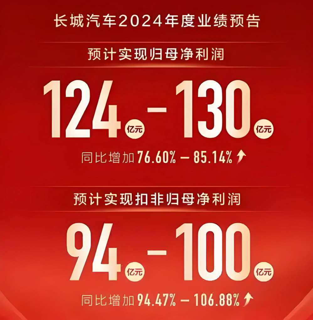 数据显示,2024年长城汽车净利润在124亿~130亿左右,与上年同期相比将增加53.78亿元到59.78亿元,同比增加76.60%到85.14%。而去年整个中国汽车市场盈利在400亿左右,长城基本上占到了1/4。若按照归母净利润的中值,除以总销量123.33万辆,长城汽车2024单车归母净利润超过1.03万元,笑傲汽车行业。