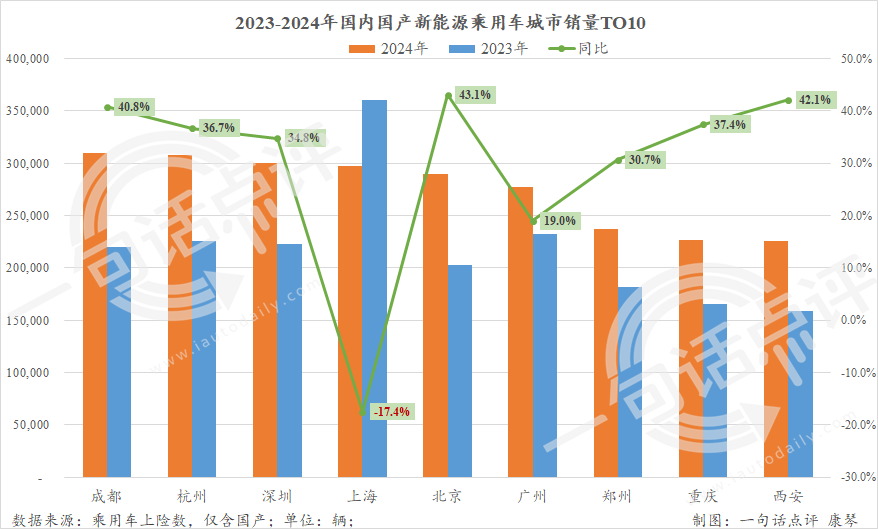 以占据国内乘用车市场中占比超过95%的国产车(因进口车体量较小,文章主要采用国产车数据,下文同)数据为例,去年乘用车销量城市的冠亚军分别是成都和北京,上海只排名第3。若以新能源销量计算,去年上海更是都没能站在领奖台上,落后于成都、杭州和深圳,仅排名第4。