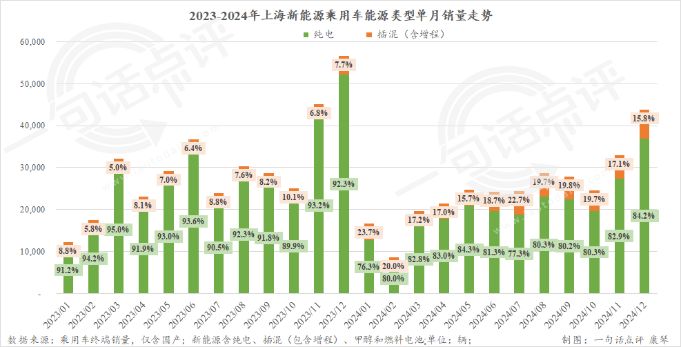 因此,当去年初新政策开始落地实施,受到直接影响的上海纯电乘用车市场就开启了跌跌不休之路,全年仅1月在较低的同期基数上实现13.7%的增长,其余月份均大幅走跌。