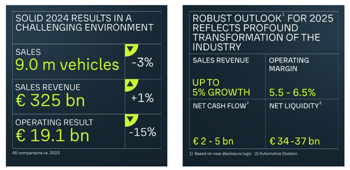 虽然大众集团2024年业绩浮动,包括销量、净利润等关键数据出现不同程度的下滑,但其对2025年依然保持谨慎乐观的态度。大众集团预计2025年集团的销售收入将增长高达5%,而营业销售回报率预计在5.5%至6.5%之间。