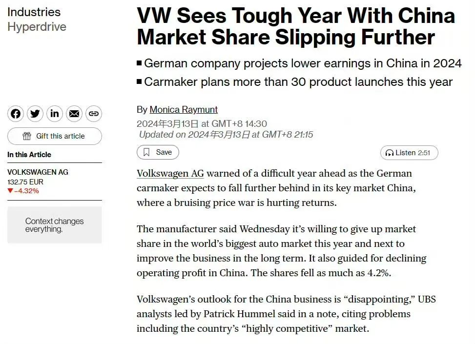 基于下滑的销量和下滑的利润,大众CEO奥博穆称,“2024年是充满各种挑战的艰难一年。”