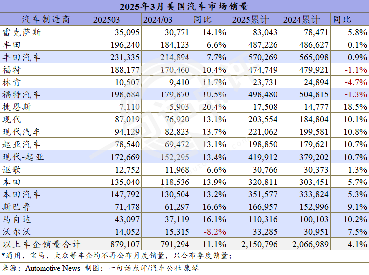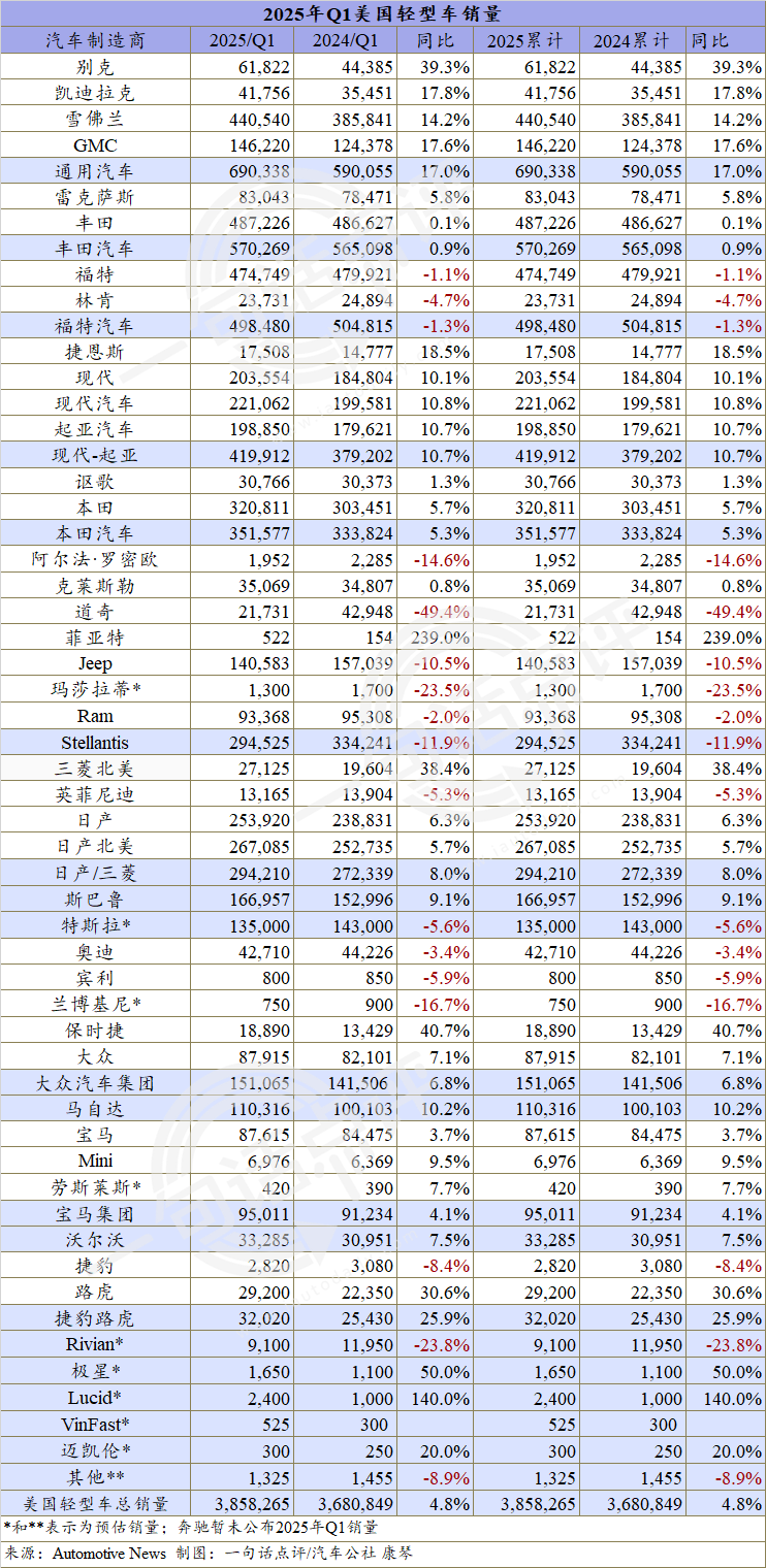 整体车市走势上扬,一季度美国市场中的绝大多数车企也都收获颇丰。