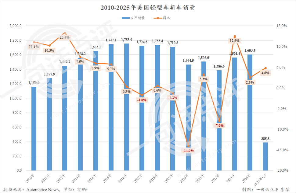 其实,如果新关税政策一直持续到年底,今年美国乘用车新车市场的年销量可能会低于1500万辆。