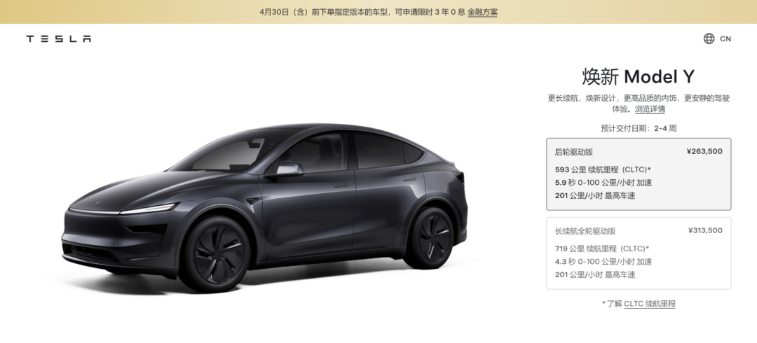 而上月,更是在华针对刚刚开启交付、绝对的主力车型焕新Model Y后轮驱动版,推出了3年0息与5年超低息政策,月供最低低至3808元。而进入4月,更是将该政策覆盖到了全系。
