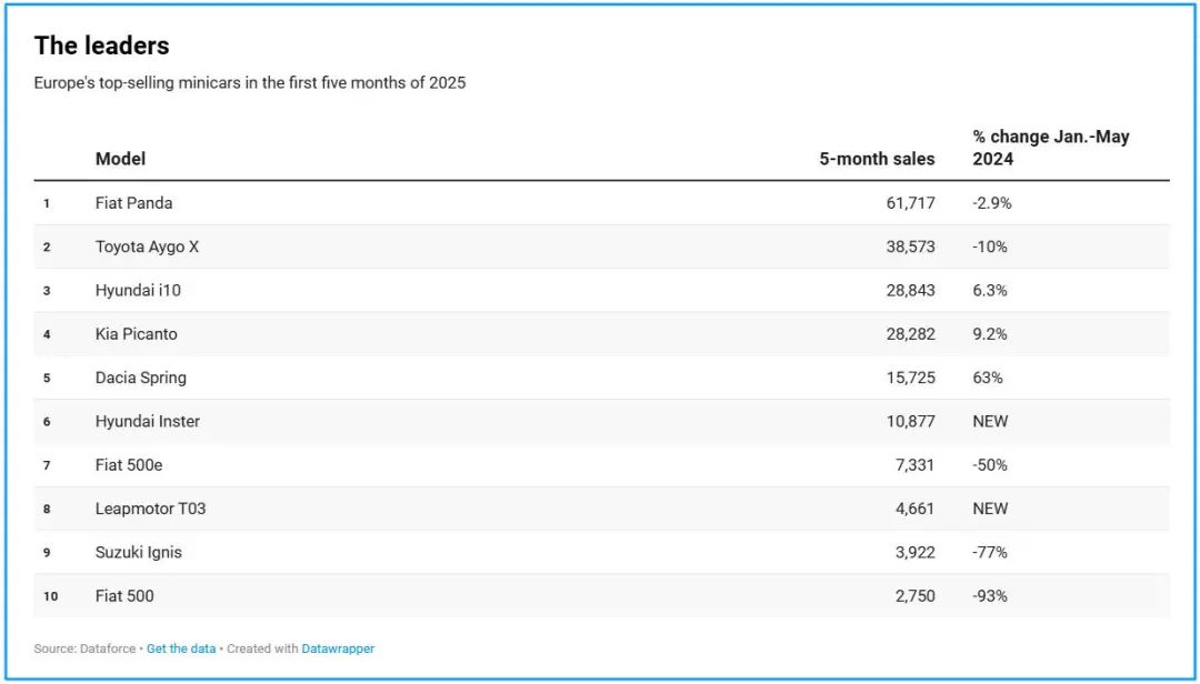 升级版达契亚Spring纯电动汽车表现出色,成为该细分市场第五大畅销车型,五个月内销量增长了62%,达到15,725辆。此外,Stellantis支持的中国品牌零跑汽车推出的T03也加入了竞争行列。
