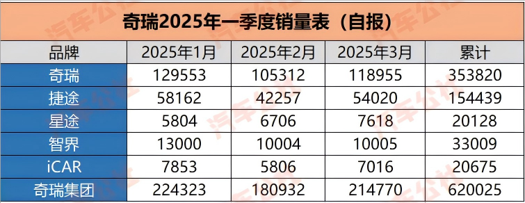 从集团品牌3月销量的细分来看,其中,奇瑞汽车股份有限公司(简称奇瑞汽车)3月销量为197,614辆,同比增长10.9%。一季度,累计销售590,533辆,同比增长18.8%。新能源销量方面,3月销量为62,210辆,一季度累计销售163,458辆,同比增长171.8%。