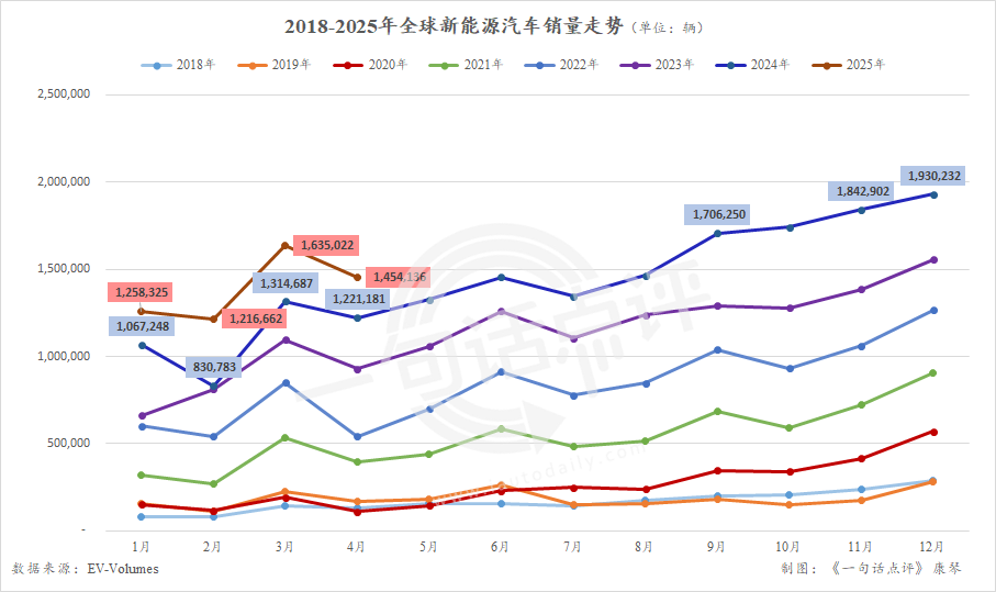 根据EV-Volumes的统计数据,4月全球轻型车(含轿车、SUV、MPV和皮卡)新能源销量同比增长22%至145.4万辆。其中,纯电同比增长26%至100万辆左右,插混则增长15%至约50万辆。