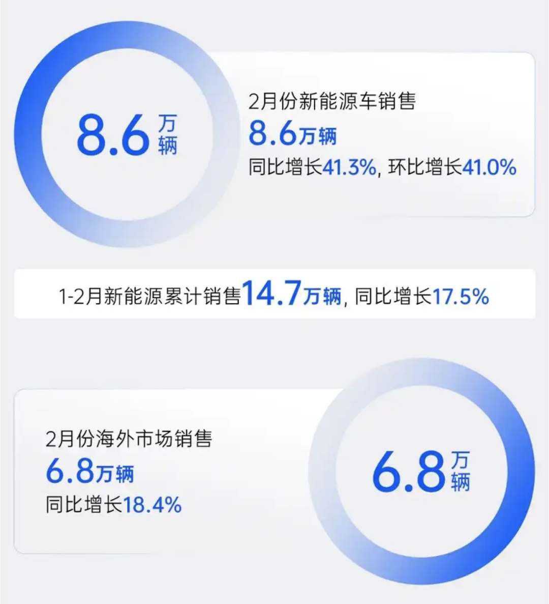 新能源车表现上,2月上汽新能源车销售8.6万辆,同比增长41.3%;1-2月,累计销售14.7万辆,同比增长17.5%。
