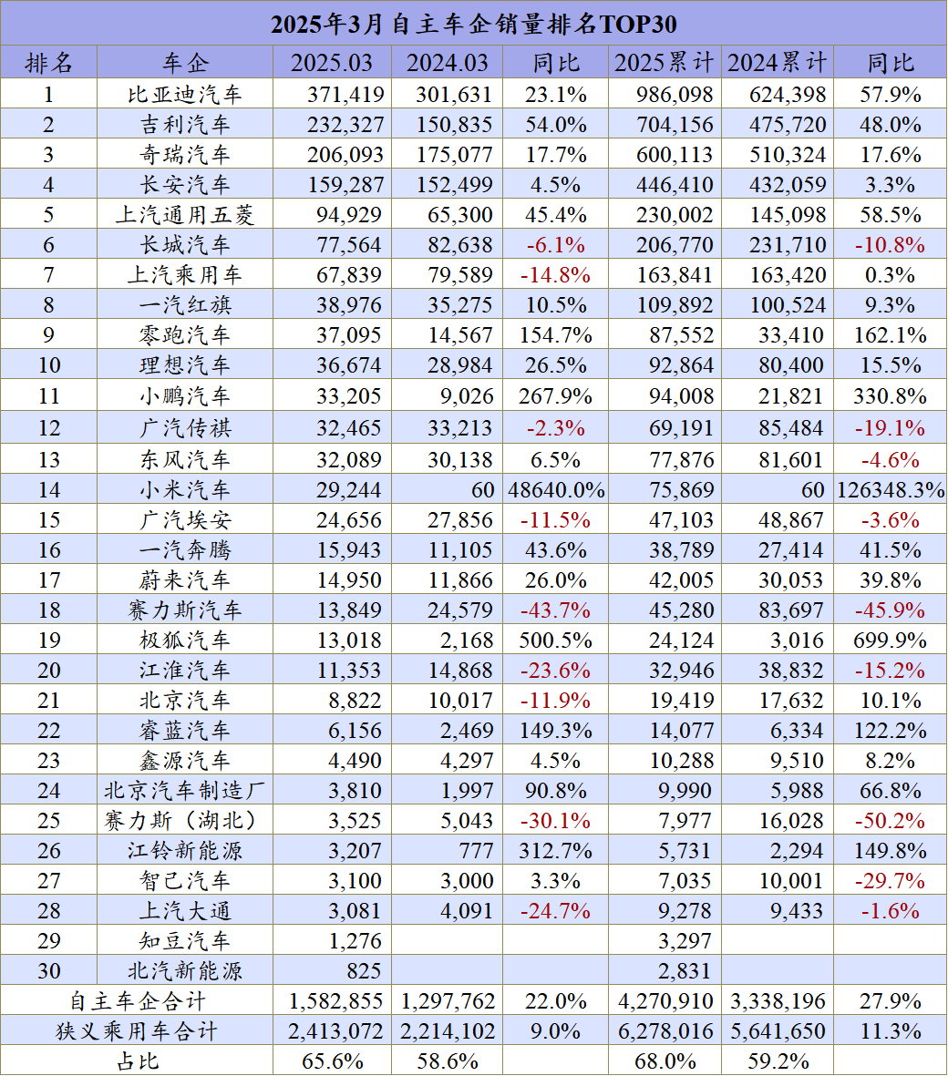 包括从3月份和一季度的销量数据就可以发现,自主四强无论是单月销量还是累计同比销量都是增加的。按理说他们销量排名靠前,增长的压力也是巨大的,但市场的结果就是比亚迪和吉利一季度的增幅差不多在50%左右。
