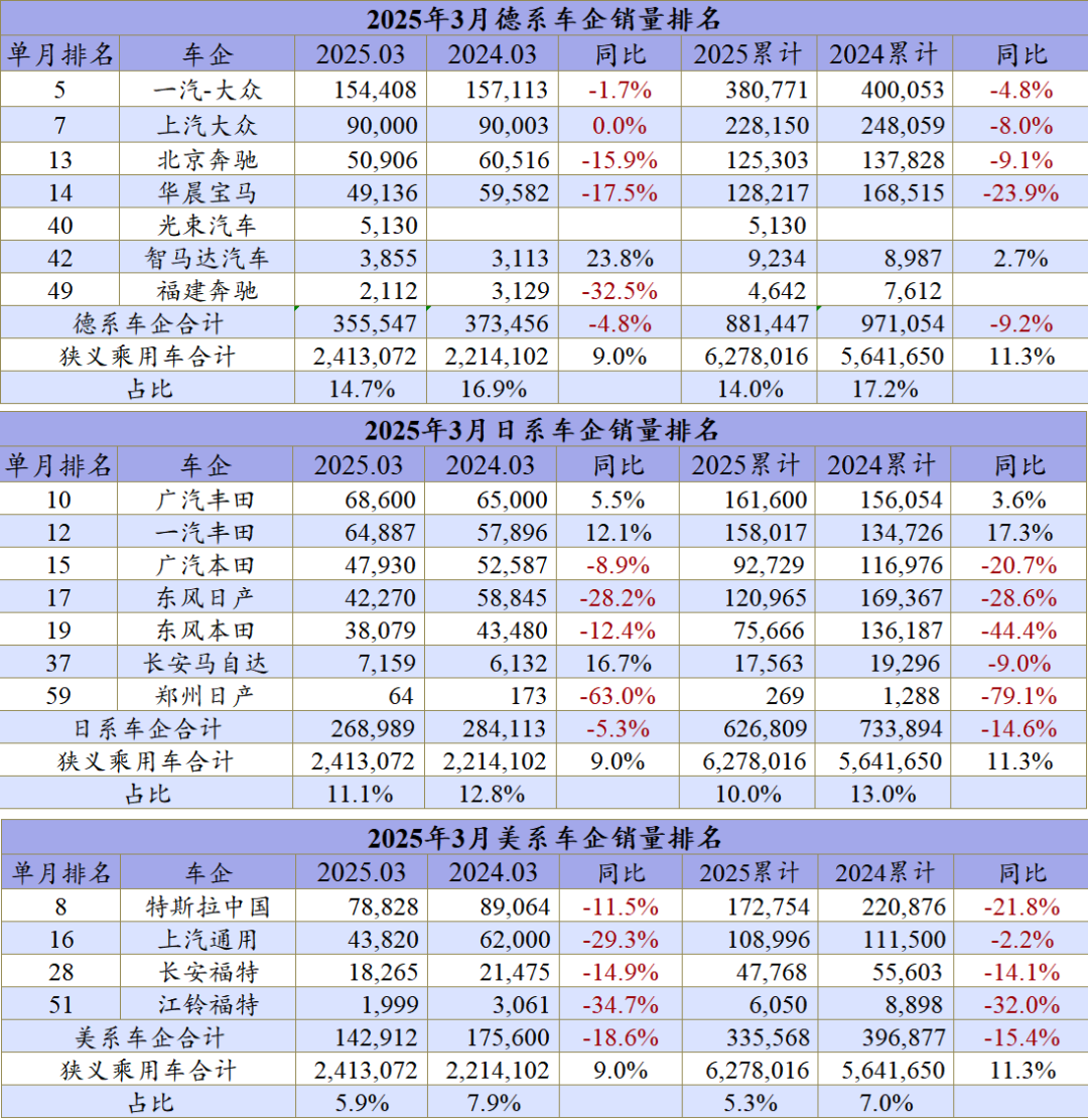 德系、日系、美系的份额,在自主破7的背景下,被压缩得较为厉害。比如德系的份额已经跌至14%了,而且一季度德系的销量还下滑了9.2%,日系的份额已经跌至10%,一季度的销量下滑达到14.6%,美系的份额已经跌至5.3%,且美系一季度的销量跌幅达到15.4%。