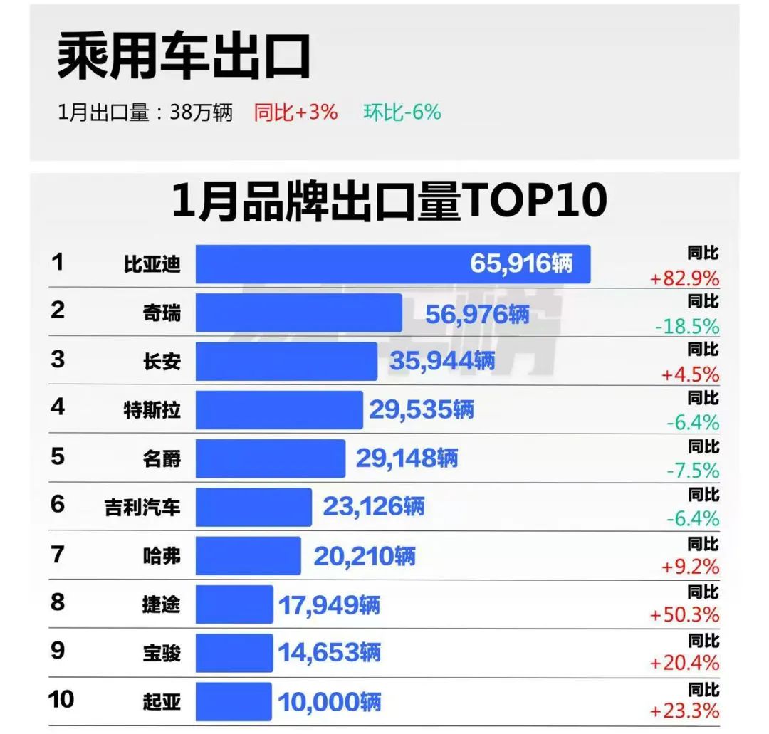 此外,自主品牌的强势表现也是推动乘用车出口增长的重要因素。1月自主品牌出口达到32.8万辆,同比增长8%,虽然环比下降9%,但整体仍保持了较高的增长态势。相比之下,合资与豪华品牌出口6万辆,同比下降19%,显示出自主品牌在出口市场上的强劲势头。