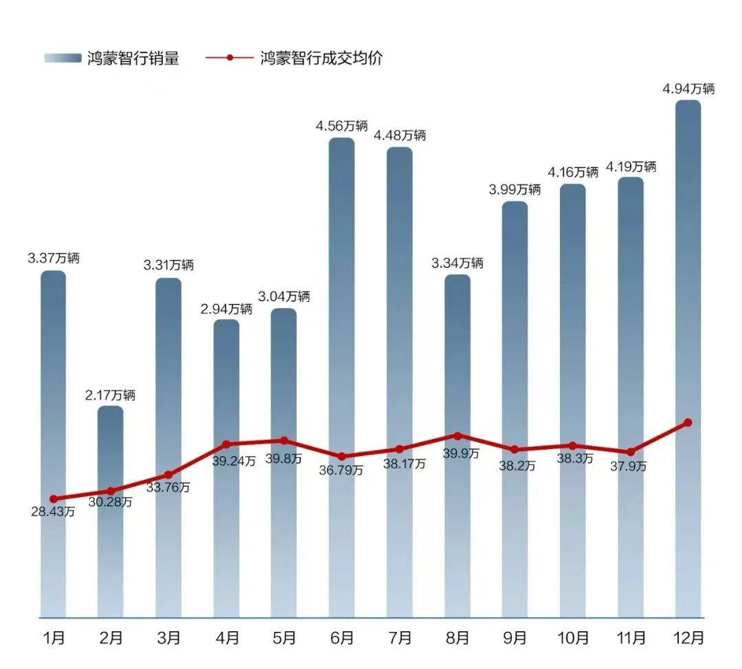 在刚过去的12月,鸿蒙智行全系交付新车49474辆,连续8个月蝉联中国汽车品牌成交均价TOP1。