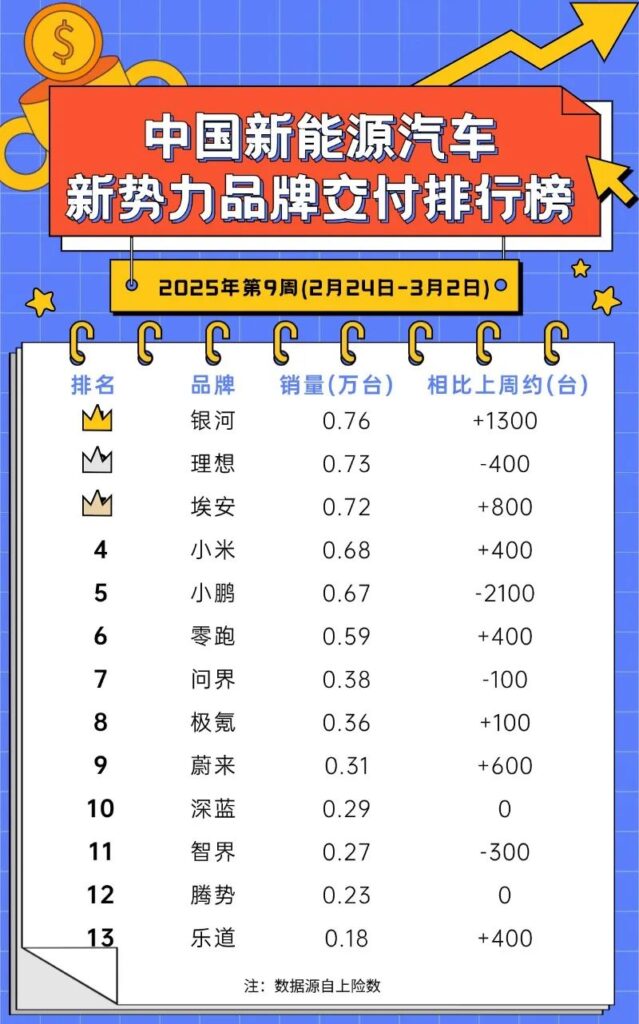 整体看新势力板块,银河增长很猛,直接比上周新增1300台,应该与2月底吉利银河2周年的促销政策和权益有关。3月3日晚,吉利银河全系调价3000-6000元不等,进入3月份的下一周交付更值得期待,继续锁定冠军问题不大。