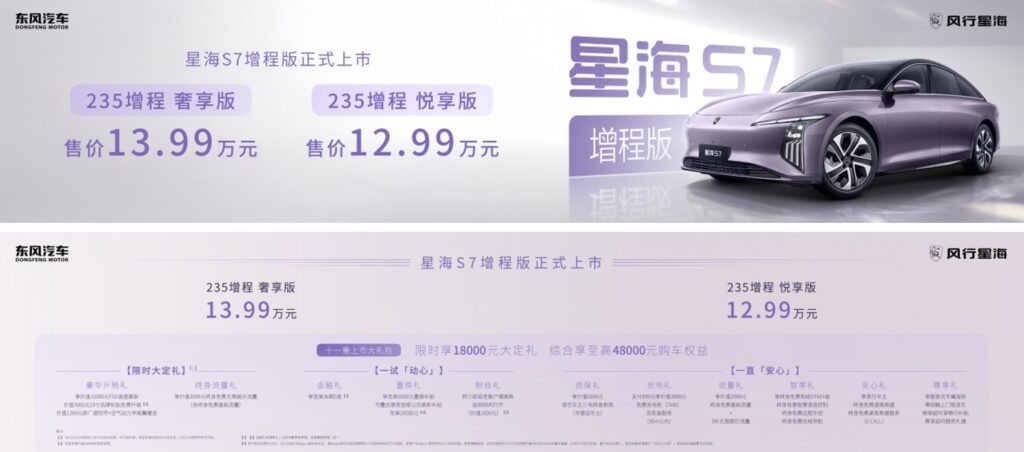 2025年4月24日,上海国际车展迎来重磅车型——东风风行星海S7增程版正式全球上市,新车推出悦享版与奢享版两款配置,售价分别为12.99万元和13.99万元。作为东风风行新能源序列“星海”的力作,该车以“量子架构+马赫超级增程”技术组合、1250km超长续航及颠覆性定价,成为中大型增程轿车市场的破局者。