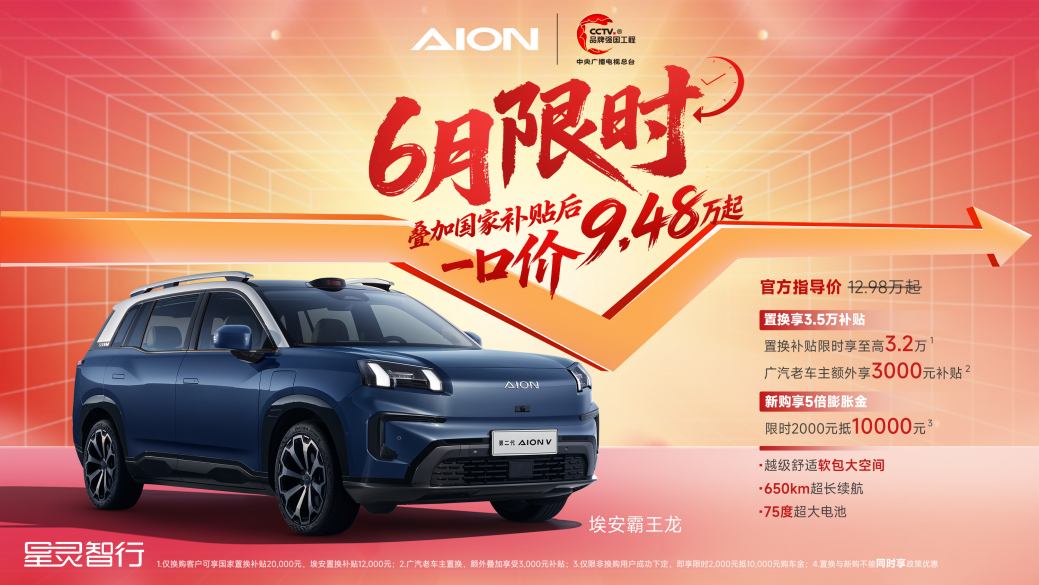进入6月,埃安霸王龙还推出限时补贴活动,叠加国家补贴后一口价9.48万起,其中置换补贴最高3.2万,广汽老车主还可增享3000元补贴。新购用户这可限时享受5倍膨胀礼,2000元抵1万元,高价值感进一步凸显,早日入手埃安霸王龙不失为明智之选。