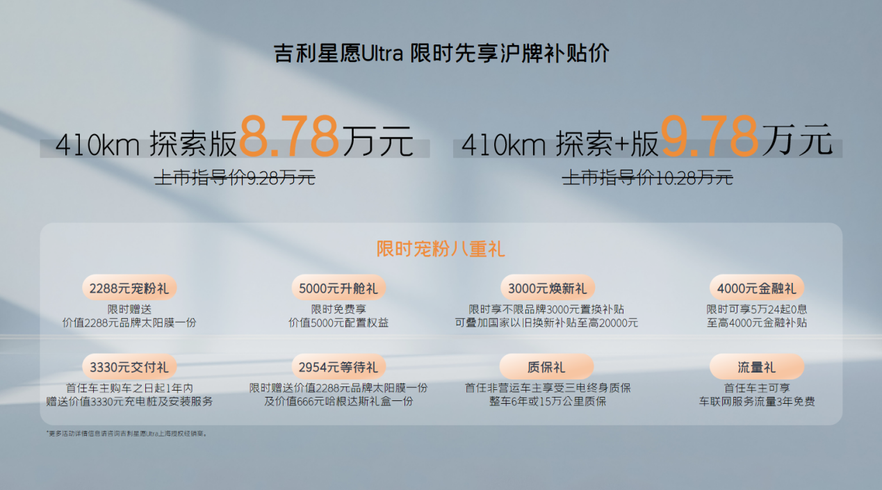 为助力上海绿色出行升级,星愿Ultra推出限时先享沪牌补贴价8.78万元起,并配套八大购车权益。除5000元沪牌补贴外,消费者还可享受宠粉礼、升舱礼、焕新礼、金融礼、交付礼、等待礼等专属礼遇。通过政策赋能与产品价值的双重突破,星愿Ultra正推动更多家庭迈入智慧出行新时代。