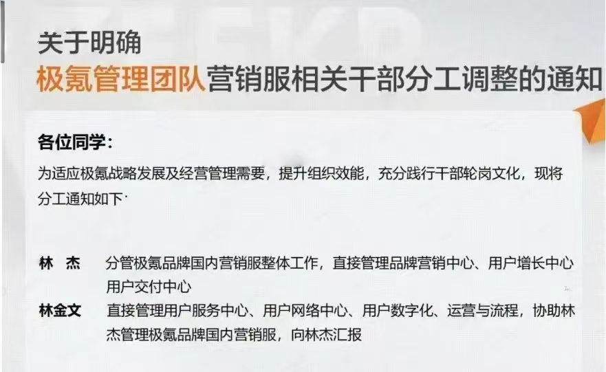 原极氪销售负责人林金文,直接管理用户服务中心、用户网络中心、用户数字化、运营与流程,协助林杰管理极氪品牌国内营销服务,向林杰汇报。